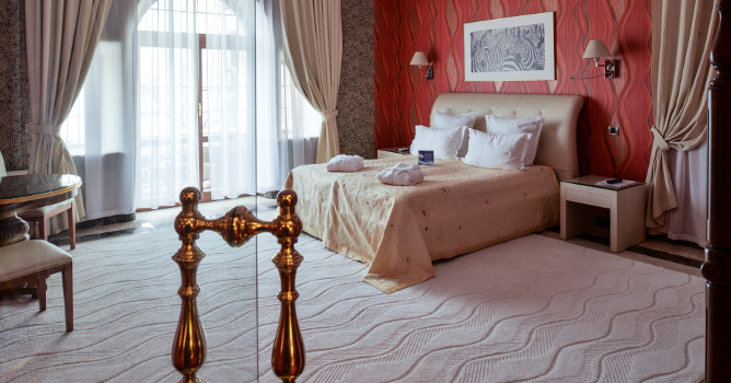 Дизайн каждого из номеров индивидуален, все номера имеют свое оригинальное название. Внутреннее убранство номеров отличается высоким качеством и комфортом, изысканным стилем и элегантным цветовым решением. Для оформления интерьеров использованы исключительно натуральные, экологически чистые материалы: дерево и мрамор.